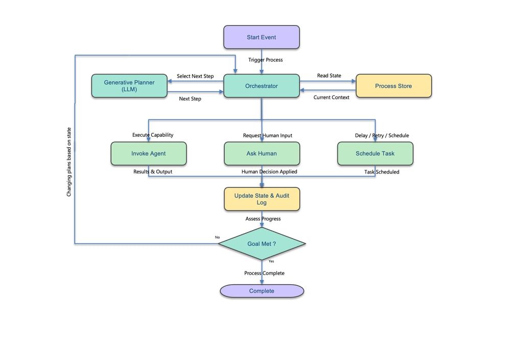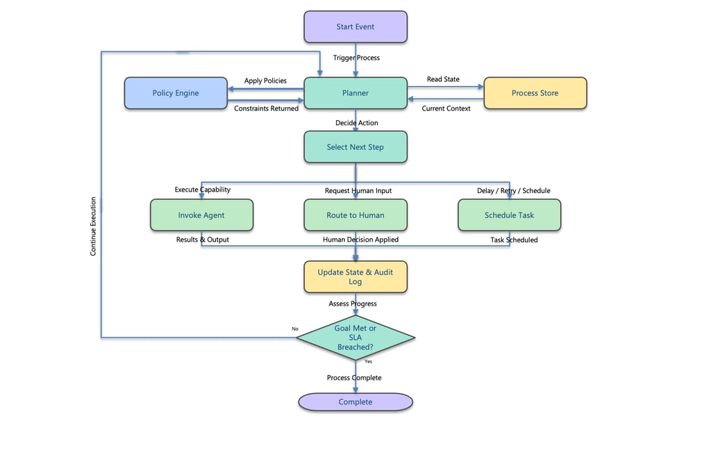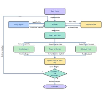 Unlike static workflows, this loop is dynamic and state-driven—the next action is chosen based on context, policy, and outcomes, rather than a hard-coded sequence.